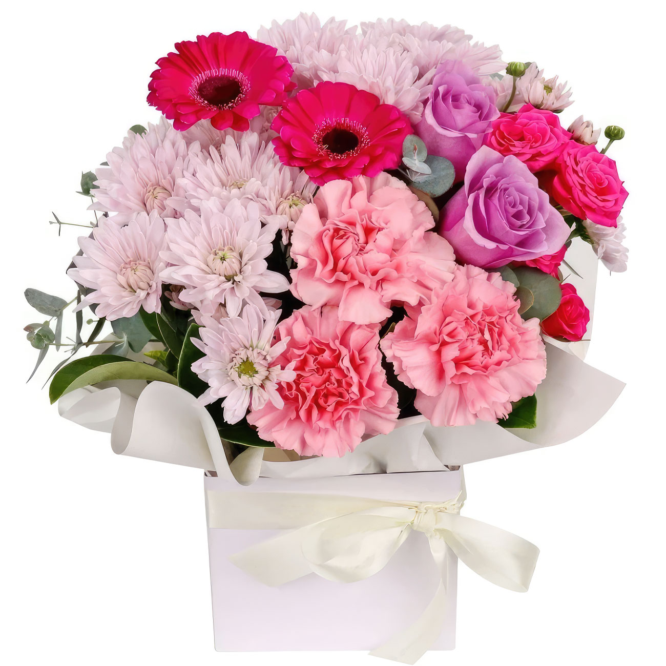 Гербера розовая, роза одноголовая сиреневая, роза кустовая розовая, хризантема кустовая розовая, гвоздика розовая. Упаковка (шляпная коробка, квадратный бокс, коробка сердце, оазис)
